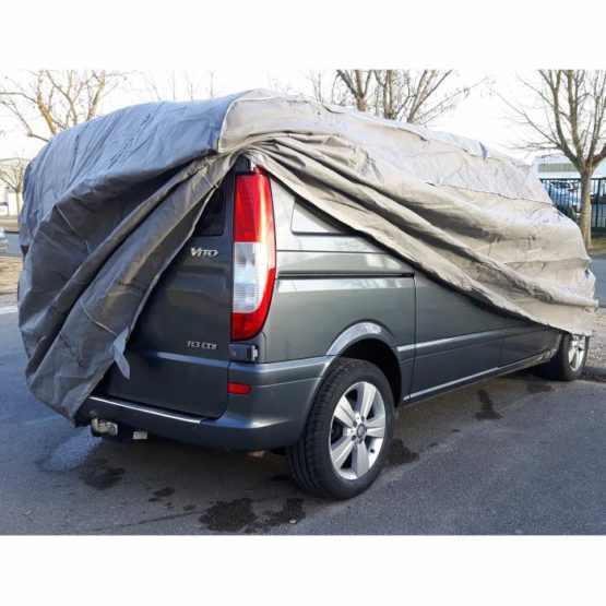 Cette bâche est semi sur-mesure, c’est à dire que sa découpe est réalisée pour les utilitaires de la catégorie du Mercedes Vito (au choix, court ou long). Ceci avec une marge de 20 cm pour l’installation mais l’ajustement est impeccable grâce à un cordon de serrage. La couverture de la carrosserie est totale, jusqu’aux bas de caisse.