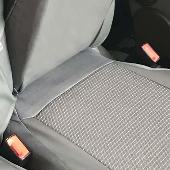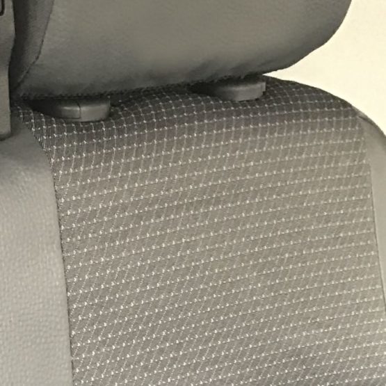 Housses de sièges pour Ford Transit Custom (après 2013) sur mesure, en tissu et simili-cuir gris. Destinées à un usage professionnel, ces housses spécial utilitaire sont conçues pour les activités les plus difficiles. comme le BTP ou la livraison. Leur robustesse est assurée par des renforts au niveau des parties sensibles comme les côtés du dossier et de l’assise. Confortables grâce à une couche supplémentaire de mousse sur le dossier, elles habillent aussi l’habitacle avec leur tissu Jacquard central.